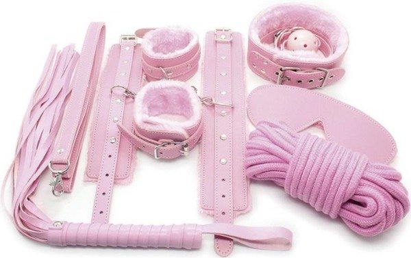 Set de 7 piezas, incluye antifaz, Gagball, látigo, muñequeras, tobilleras, collar con correa y soga
